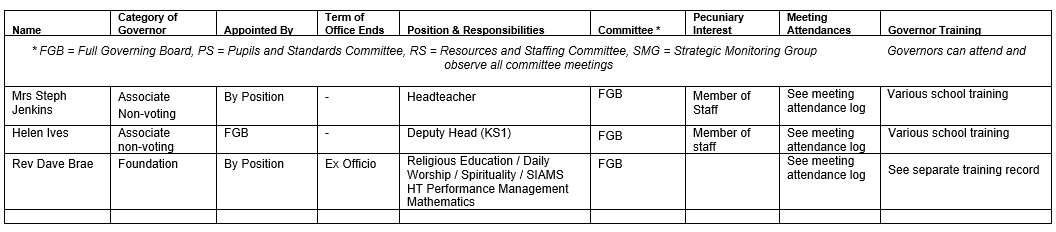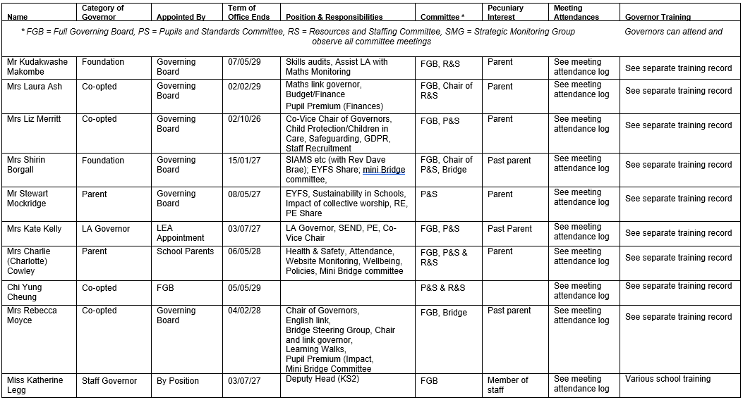 Our Governing Board consist of Parents, Teaching Staff, representatives from the Local Authority and Bristol Diocese together with co-opted Governors appointed by Board based on the skills and experience they offer.